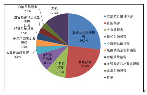 2019年國家基本藥物化學(xué)藥品和生物制品不良反應(yīng)/事件報告,按照藥品類別統(tǒng)計,報告數(shù)量排名前5位的分別是抗微生物藥、心血管系統(tǒng)用藥、抗腫瘤藥、激素及影響內(nèi)分泌藥、治療精神障礙藥;累及器官系統(tǒng)排名前5位的是皮膚及其附件損害、胃腸損害、全身性損害、神經(jīng)系統(tǒng)損害以及血液系統(tǒng)損害。