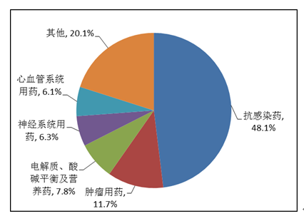 按照藥品類別統(tǒng)計,化學(xué)藥品占86.6%,中藥占12.6%,生物制品占0.8%?;瘜W(xué)藥品排名居前的藥品類別是抗感染藥、心血管系統(tǒng)用藥、腫瘤用藥、神經(jīng)系統(tǒng)用藥、電解質(zhì)、酸堿平衡及營養(yǎng)藥;中藥排名居前的藥品類別是理血劑、補益劑、祛濕劑、開竅劑、清熱劑。